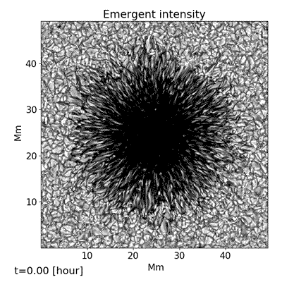 One obstacle to understanding the 11-year solar cycle is the connection between sunspots and the large-scale magnetic field in the solar interior. It is thought there is some sort of trigger that causes the magnetic field generated within the Sun to emerge from its surface and form sunspots. However, the temporal and spatial scales in the interior and on the surface are significantly different, which makes it difficult to include them both within a single model. Nevertheless, we have developed the method of calculating such a model with numerical simulation code that allows us to solve for both the solar interior and the surface for the first time in the world. Using this code, we can solve for the regions deep within the Sun at the same time as we can obtain precise sunspot models like that in Figure 5. As of 2020, we are the only group who has succeeded in this effort. We hope to continue developing this work to solve the biggest question in solar physics – the mystery behind the 11-year solar cycle.