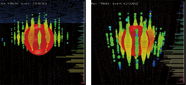 千葉大学アイスキューブグループは完成したアイスキューブによる観測データを解析して1.2PeV(PeVはエネルギーの単位で10の15乗電子ボルト)と1.4PeVのニュートリノが氷と相互作用して放射されたチェレンコフ光を捕えたと考えられる事象を発見し、2012年6月に開催された国際会議で発表しました。これは、理論的に予言されていた高エネルギー宇宙ニュートリノが実在することを示す世界初の観測成果です。